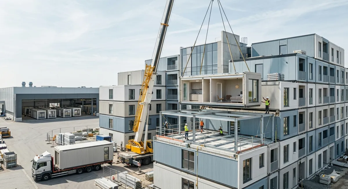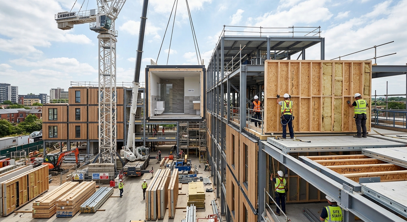 Fully formed three-dimensional modules built in a factory, transported to site, and craned into place. These modules arrive near complete, often including structure, linings, services, and finishes, before they leave the factory floor.